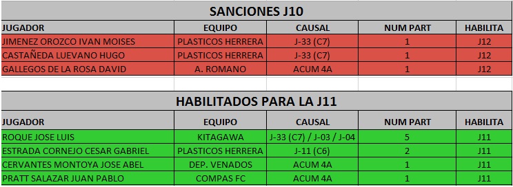 El reporte contiene los jugadores que fueron sancionados en la J10. Además, se anexan los jugadores habilitados para la J11